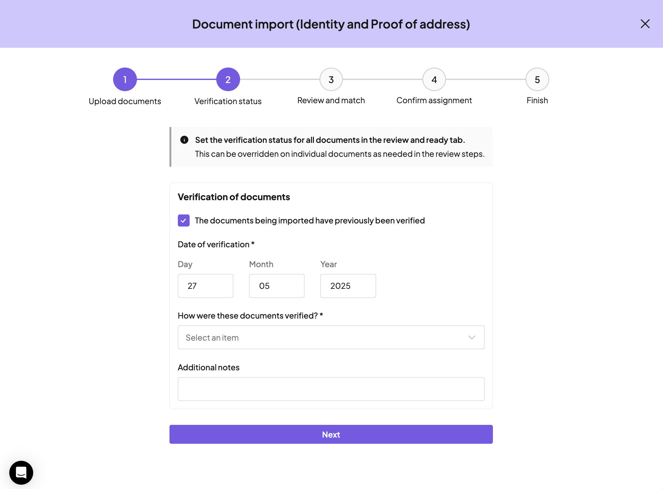 You can set what authentication method was used when you first received these files and any notes ā for example if the documents were all seen in-person, or using a verification tool.