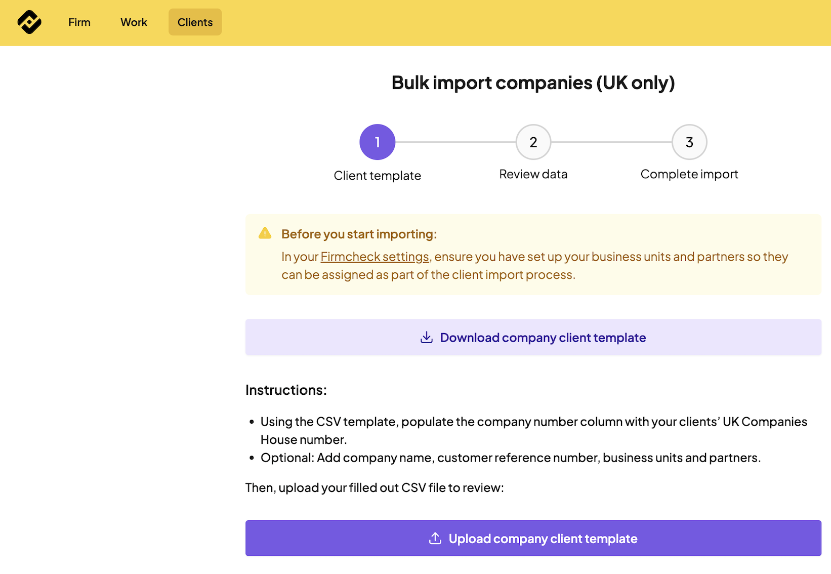 If your firm has a large client base, bulk importing your client data is the fastest and most efficient way to get started with Firmcheck.