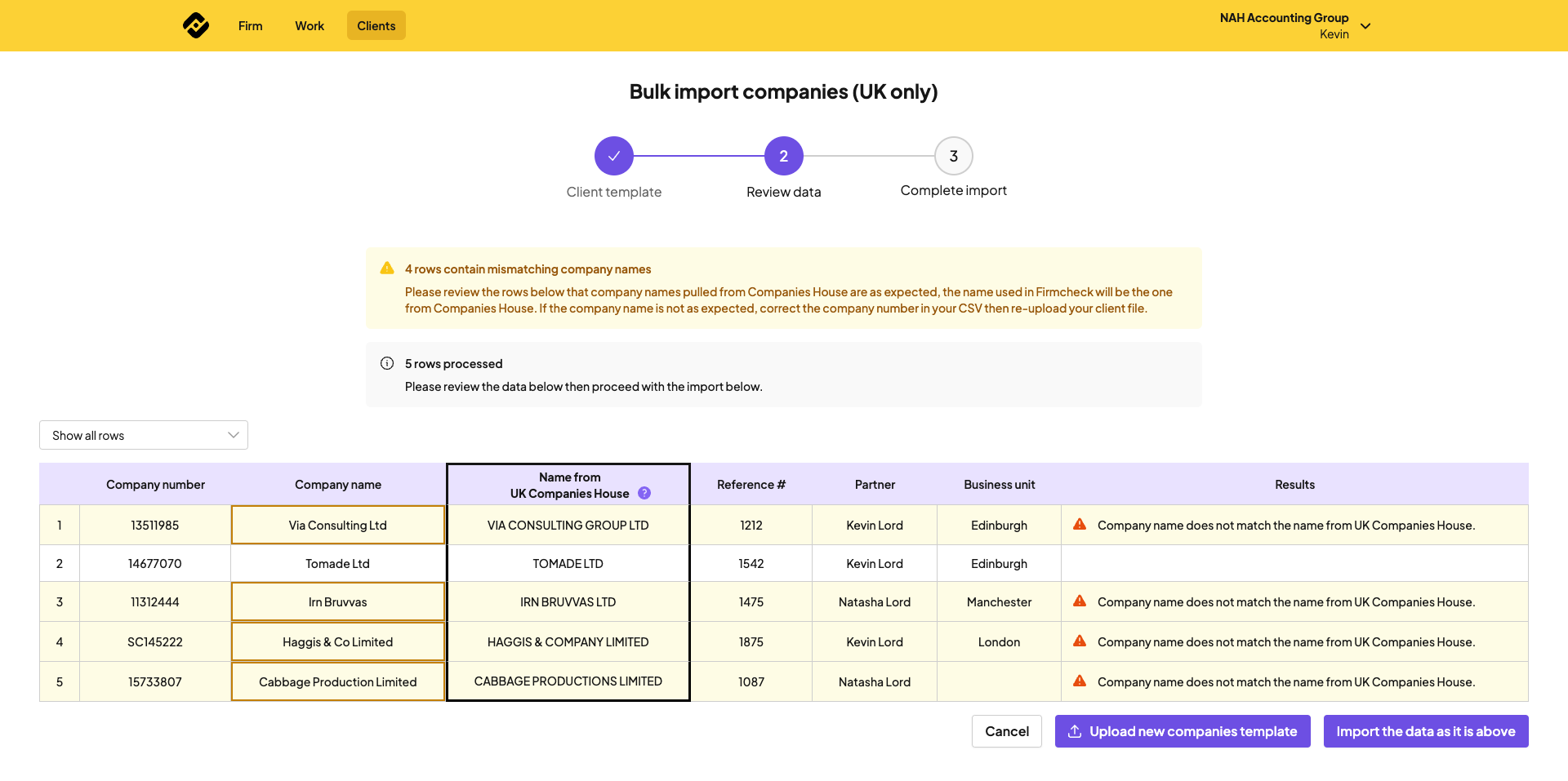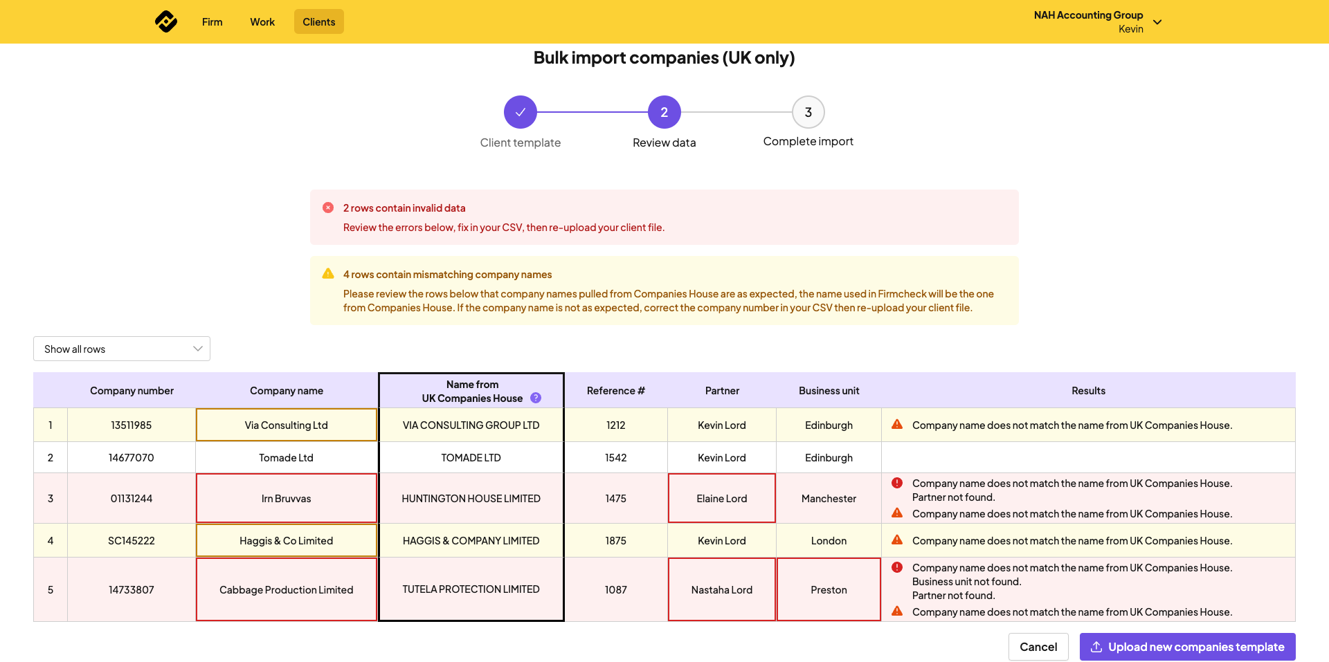 You’ll see these errors listed in the Results column. If a red warning appears and the name doesn’t match, it often means the company number is incorrect.
