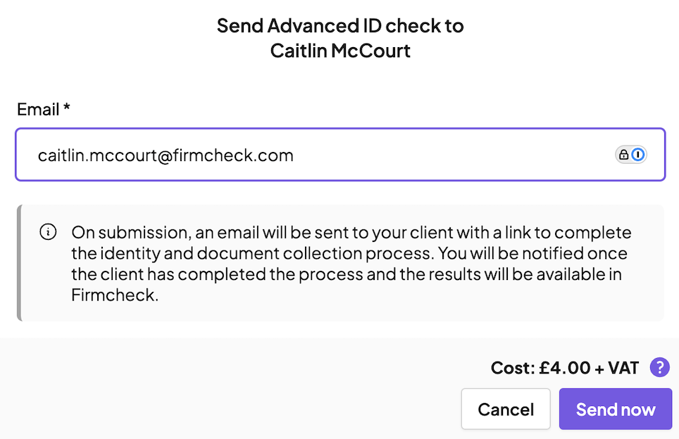 4️⃣: Once you click Advanced ID Check, a pop-up will appear asking you to confirm your client’s email address.